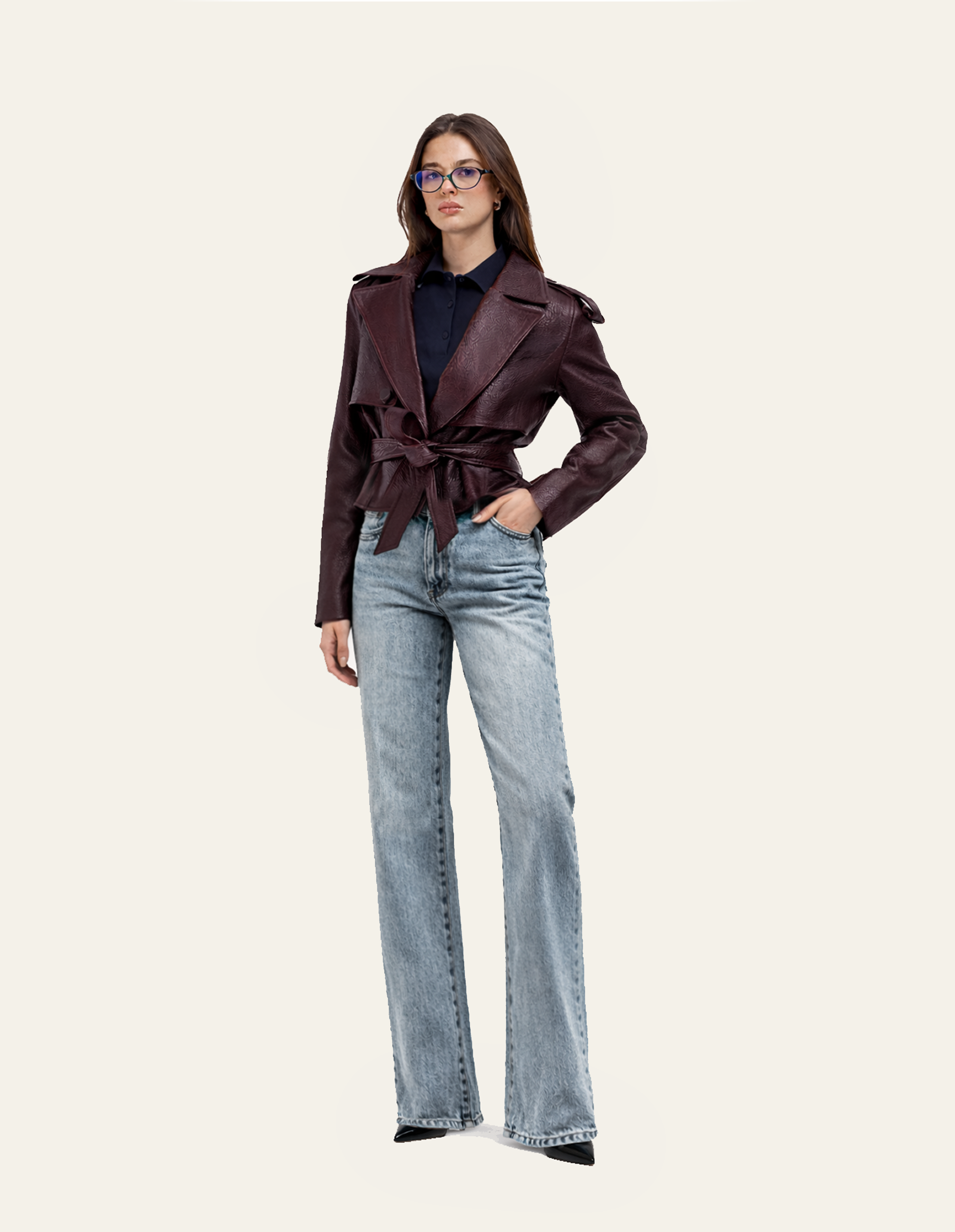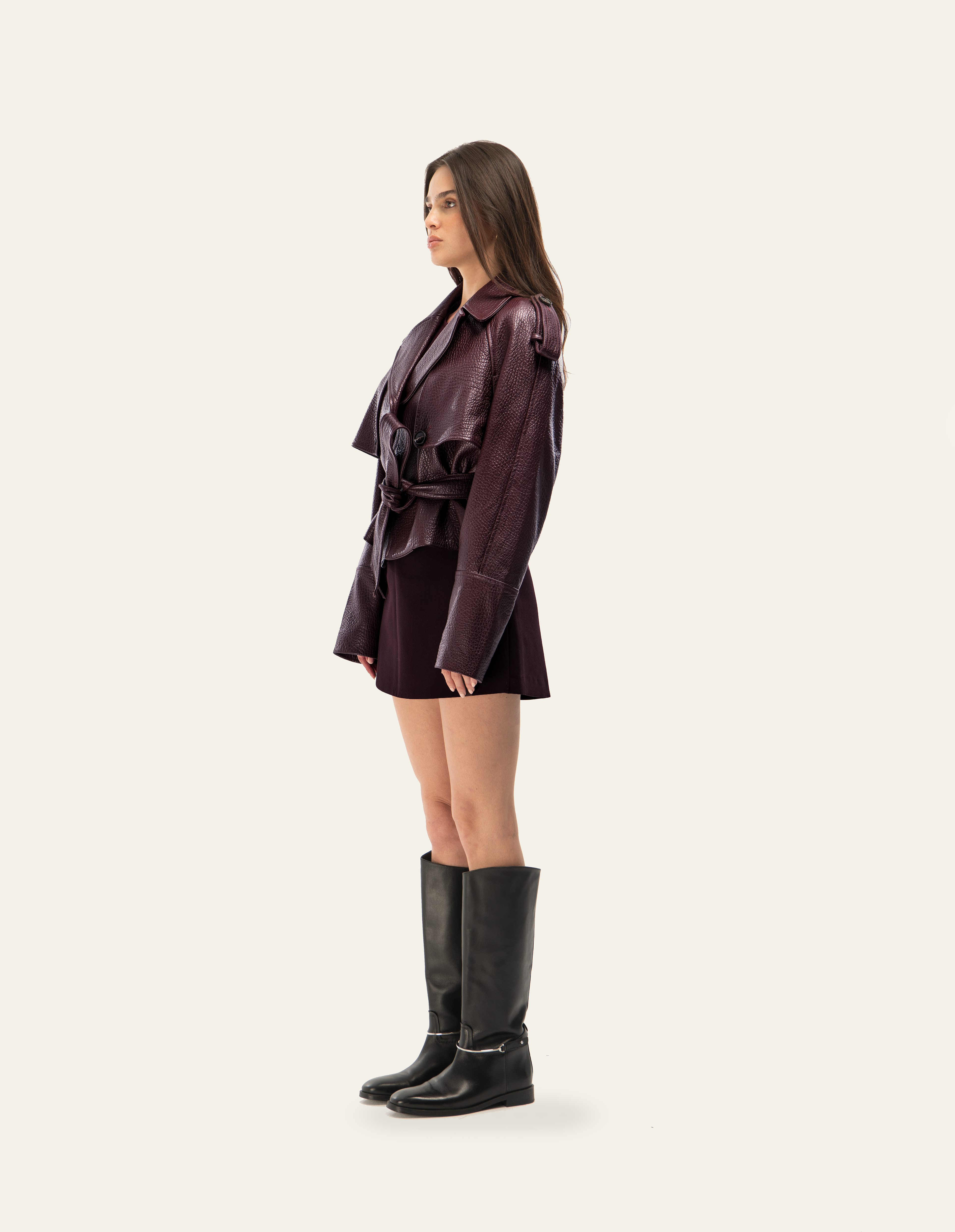 Cropped trench cut from premium grain leather. Defined by its sculpted shoulders, belted waist, and concealed button closure for a refined finish.