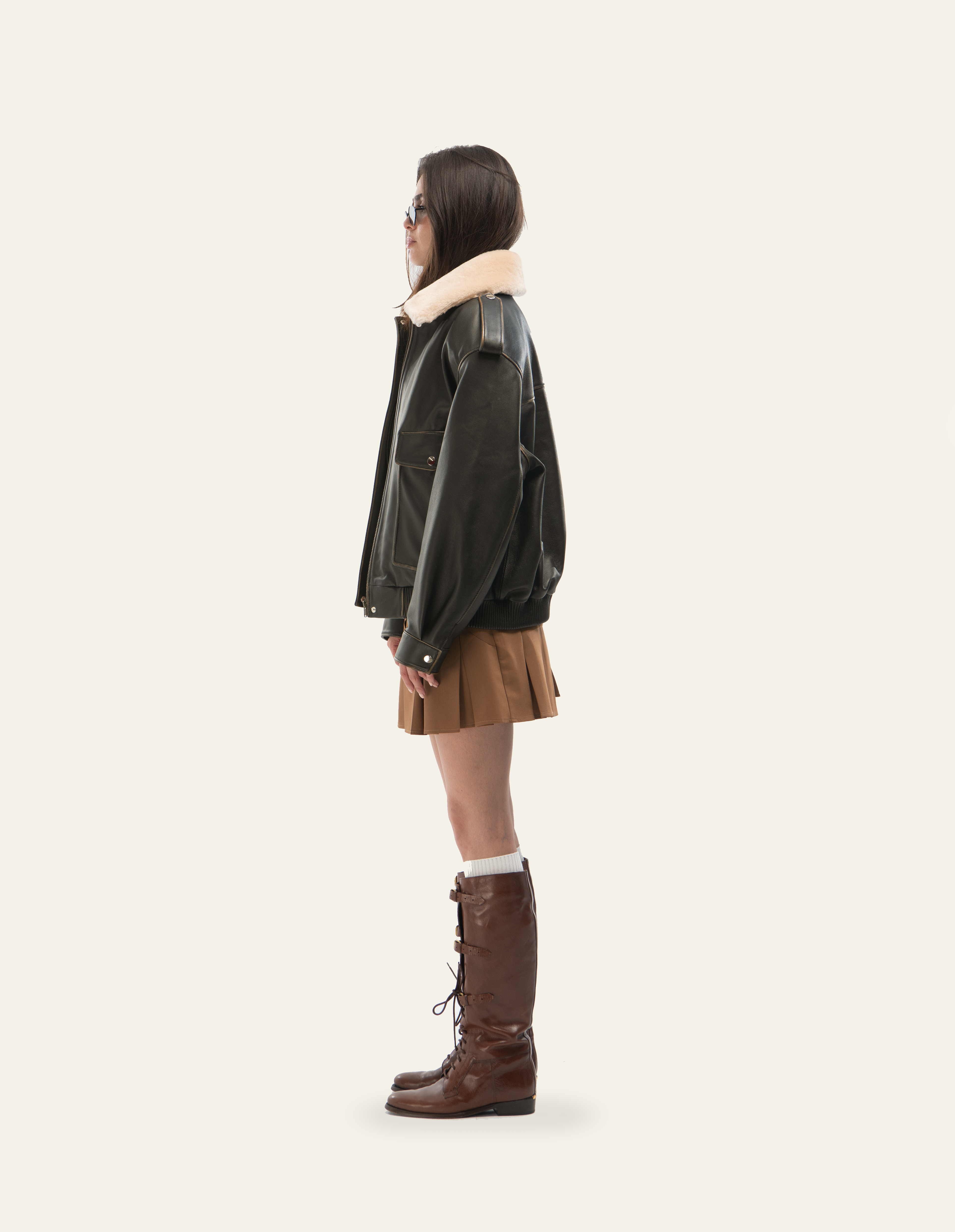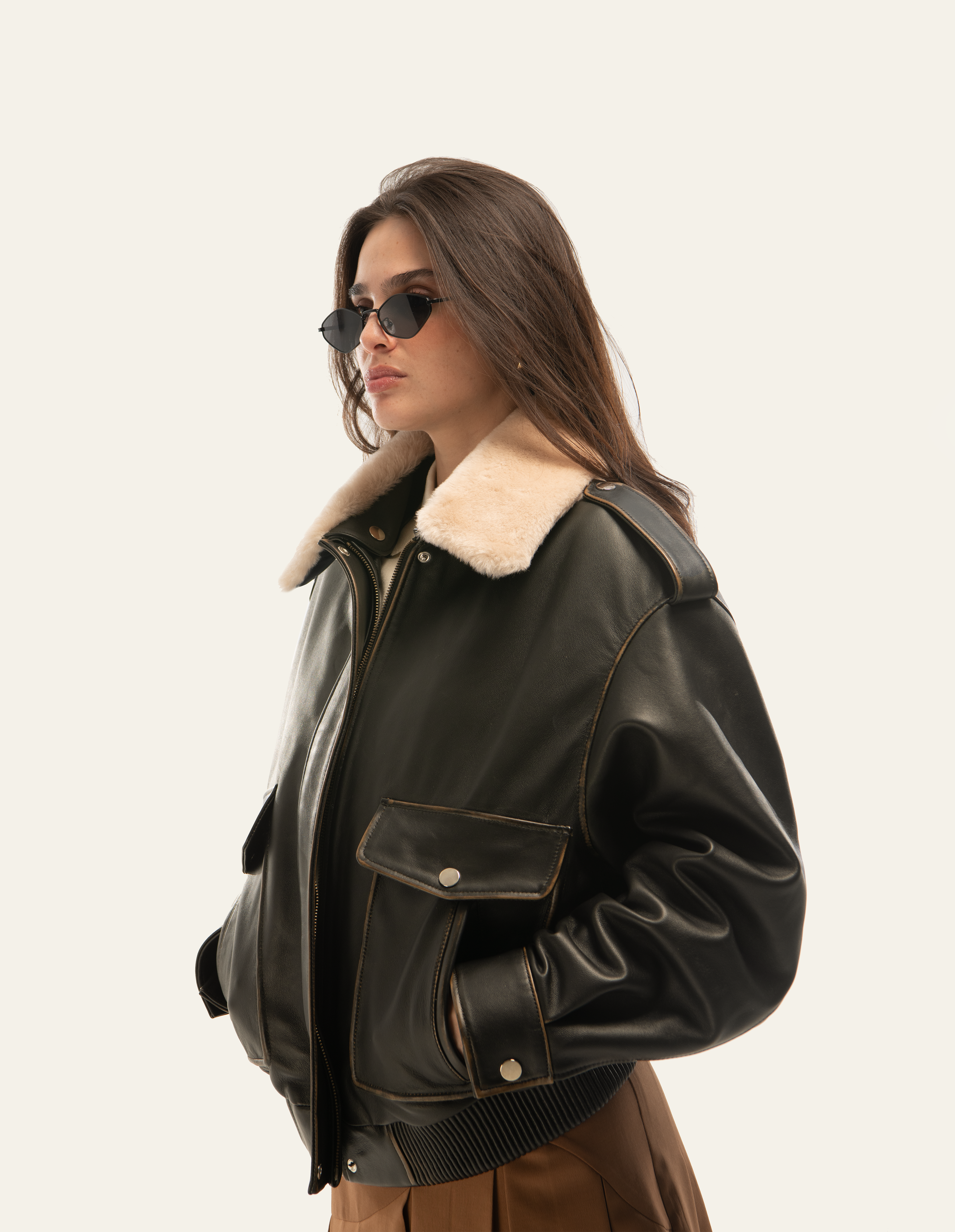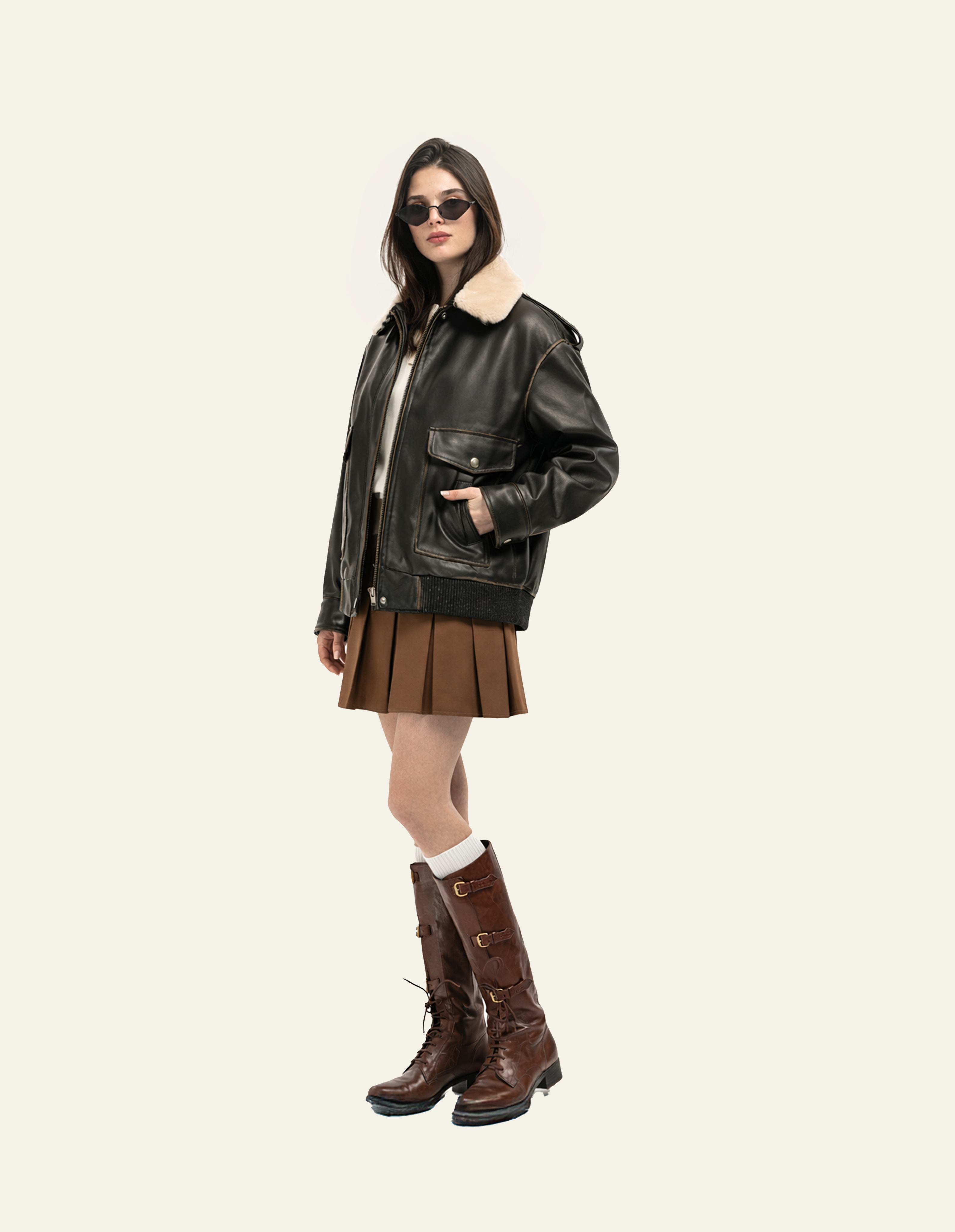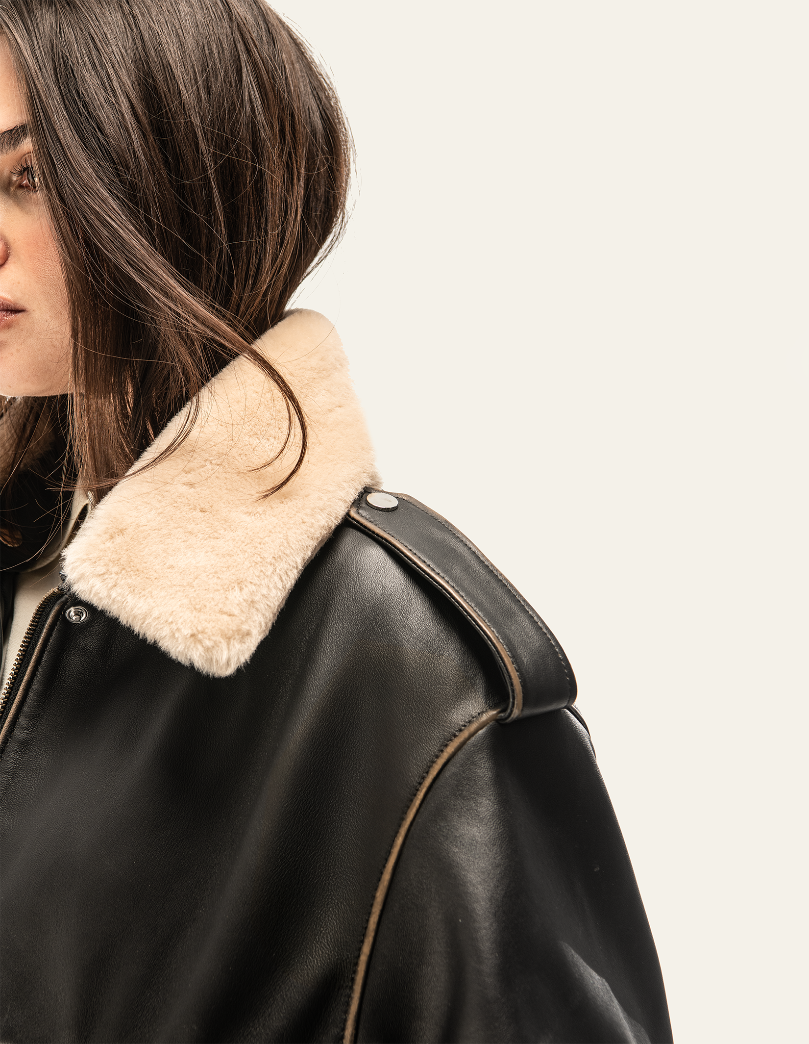 Classic aviator jacket in rich, dark brown Italian leather with a luxurious sheen. The design is highlighted by a cozy, contrasting natural Italian Merino shearling collar for warmth and texture. This collar is fully detachable, offering versatility for the seasons. It features a robust front zip closure, deep patch pockets with snap closures, and a comfortable ribbed knit hem and cuffs, embodying a rugged yet refined style.